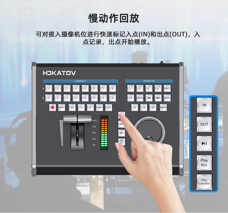 可對接入攝像機位進行快速標記入點(IN)和出點(OUT),入點記錄,出點開始播放。
