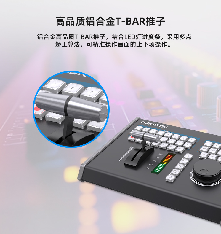 鋁合金高品質T-BAR推子,結合LED燈進度條,采用多點矯正算法,可精準操作畫面的上下場操作;