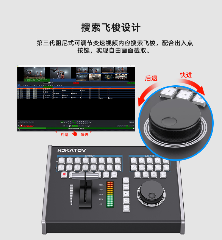 2級可調節變速視頻內容搜索飛梭設計,配合出入點按鍵,實現自由畫面截取;